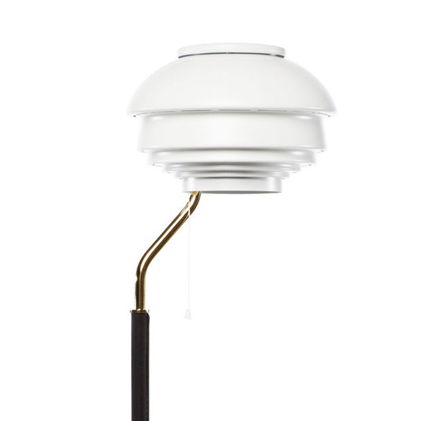 アアルト フロアランプ A808アアルトが1955年にヘルシンキのNational pensions institute の建築プロジェクト時にデザインしたフロアランプ。 このフロアランプは、スチールという透光性のない素材をサイズを違えた同心円のリングを組み合わせることにより行灯のような効果を持たせることを実現させました。 本体のブラスのアクセントとブラックのレザーで仕上げた表面はアアルトならではの素材の選択で他の器具に見られない存在感があります。 コード長3m、普通球100w 電球口金E26"